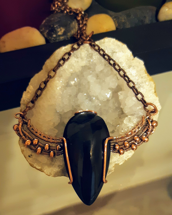 Purple velvet obsidian Oxidized copper 4cm x 6cm. The decorative chain is approximately 1 1/2 in from top of pendant to jump rings 20 in chain All done in 18ga round for base wires 28 ga for weave and 4mm copper beads